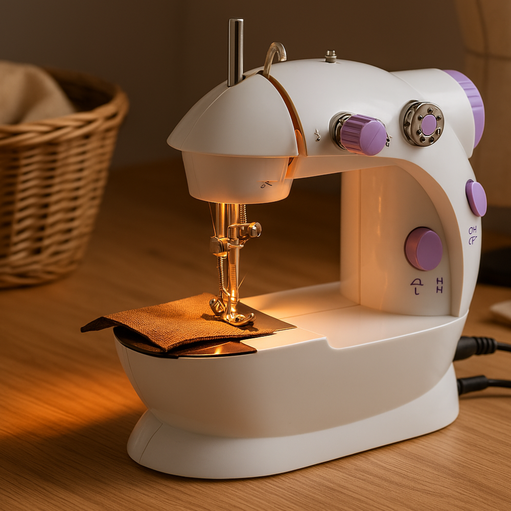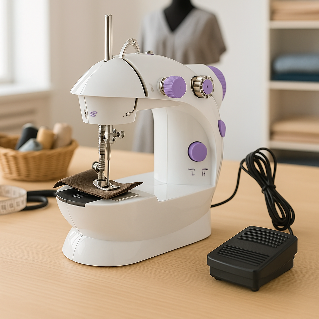 Masina de cusut electrica portabila cu pedala, alimentare dubla (baterii si priza) – solutia compacta pentru reparatii rapide si proiecte de cusut acasa