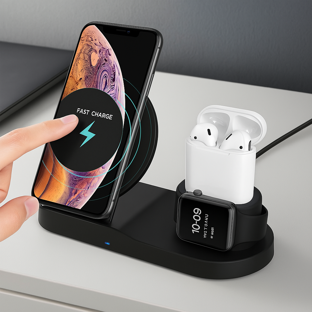 Incarcator wireless Fast Charge, 3 in 1, pentru telefon, ceas, casti