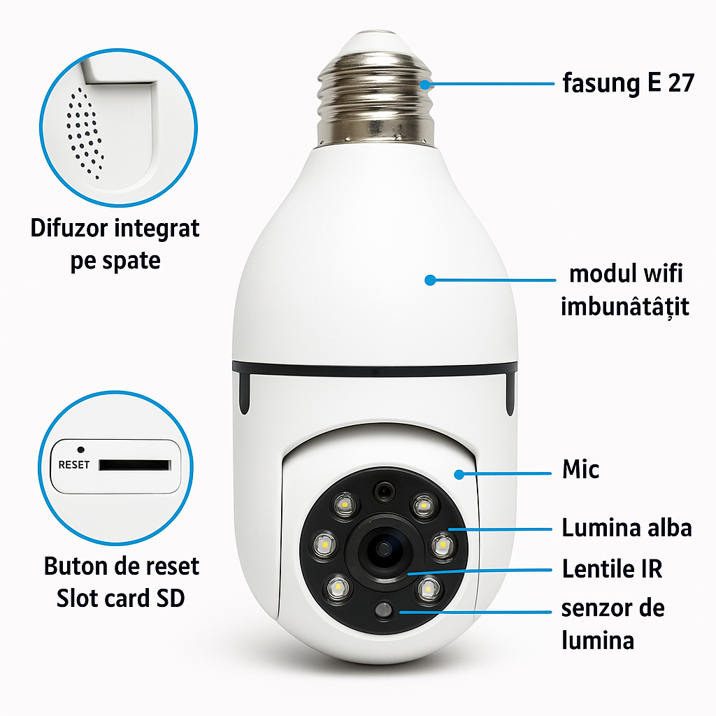 Instalează camera de supraveghere WI-FI HD tip bec și monitorizează-ți locuința sau biroul cu un dispozitiv discret, eficient și ușor de utilizat.