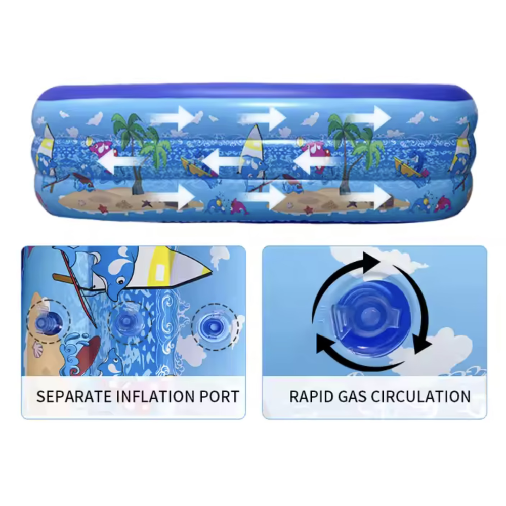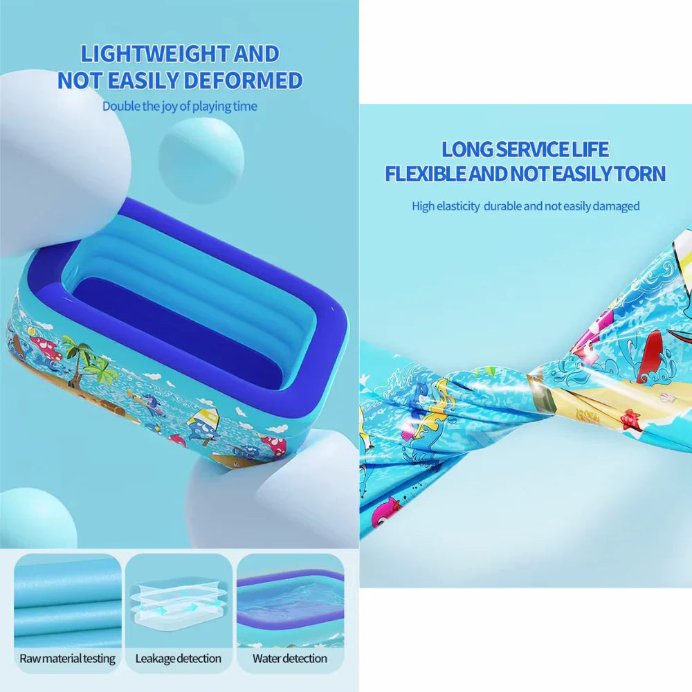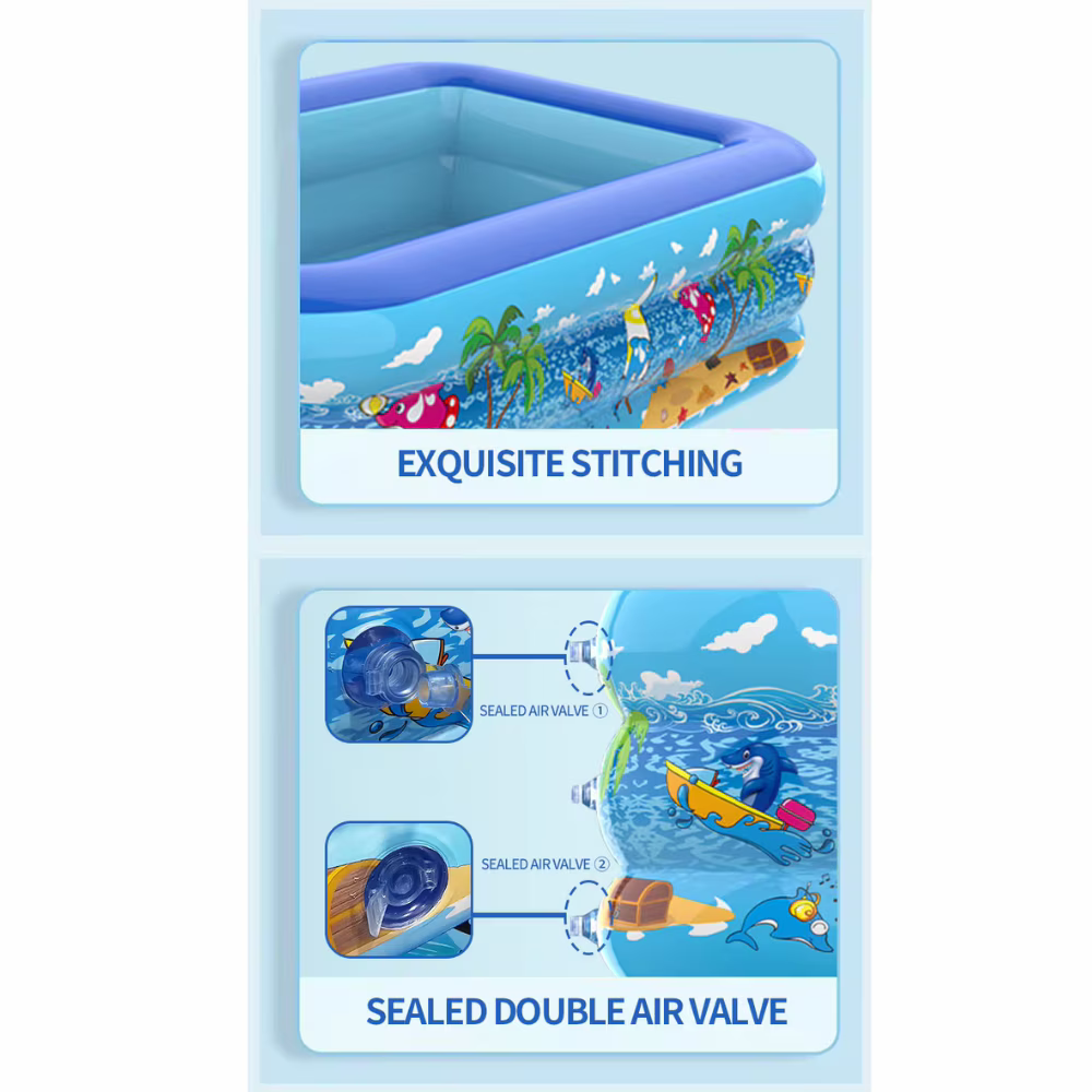 Piscina gonflabilă cu podea moale este alegerea ideală pentru zilele toride, oferind confort, siguranță și un design atractiv inspirat din lumea subacvatică.